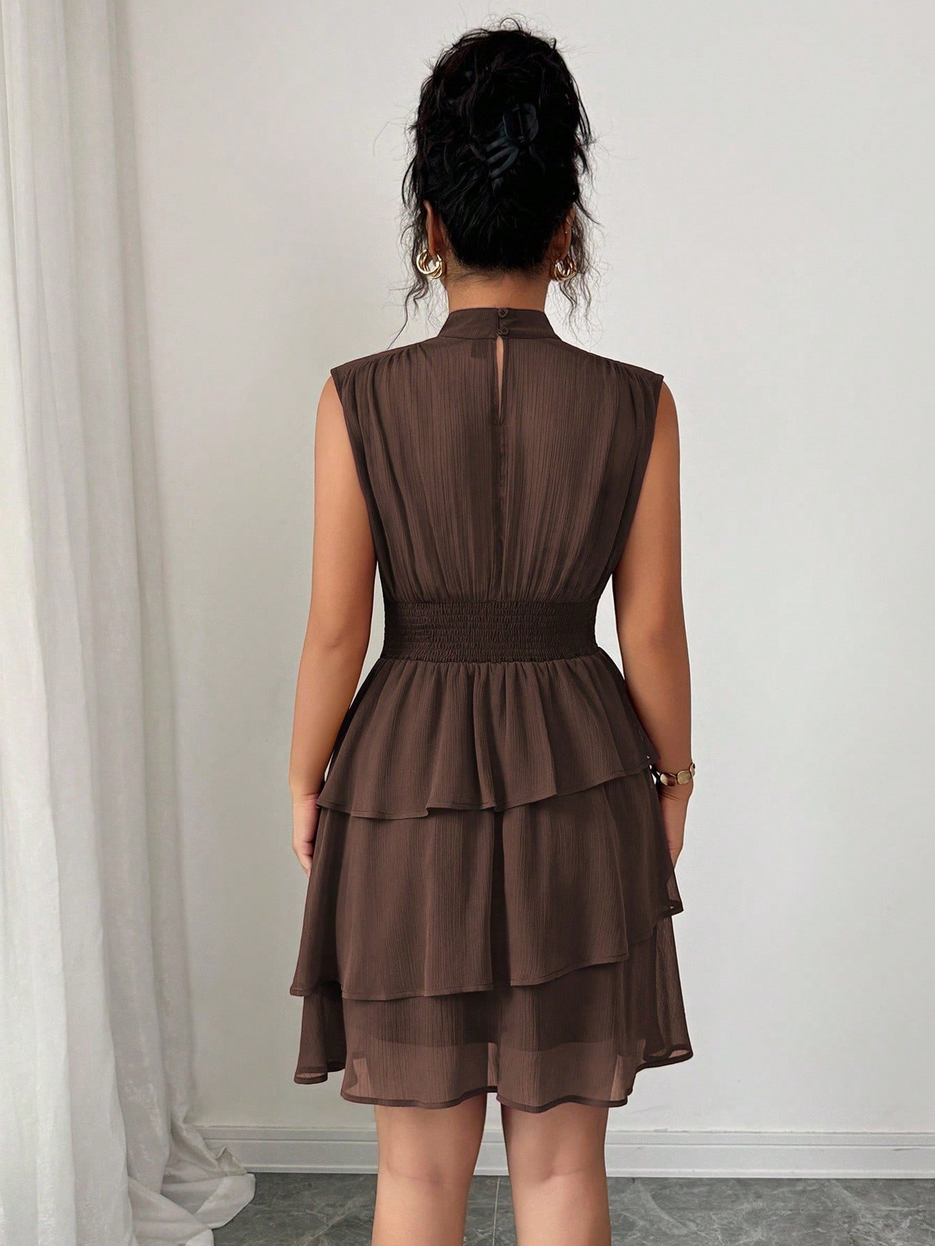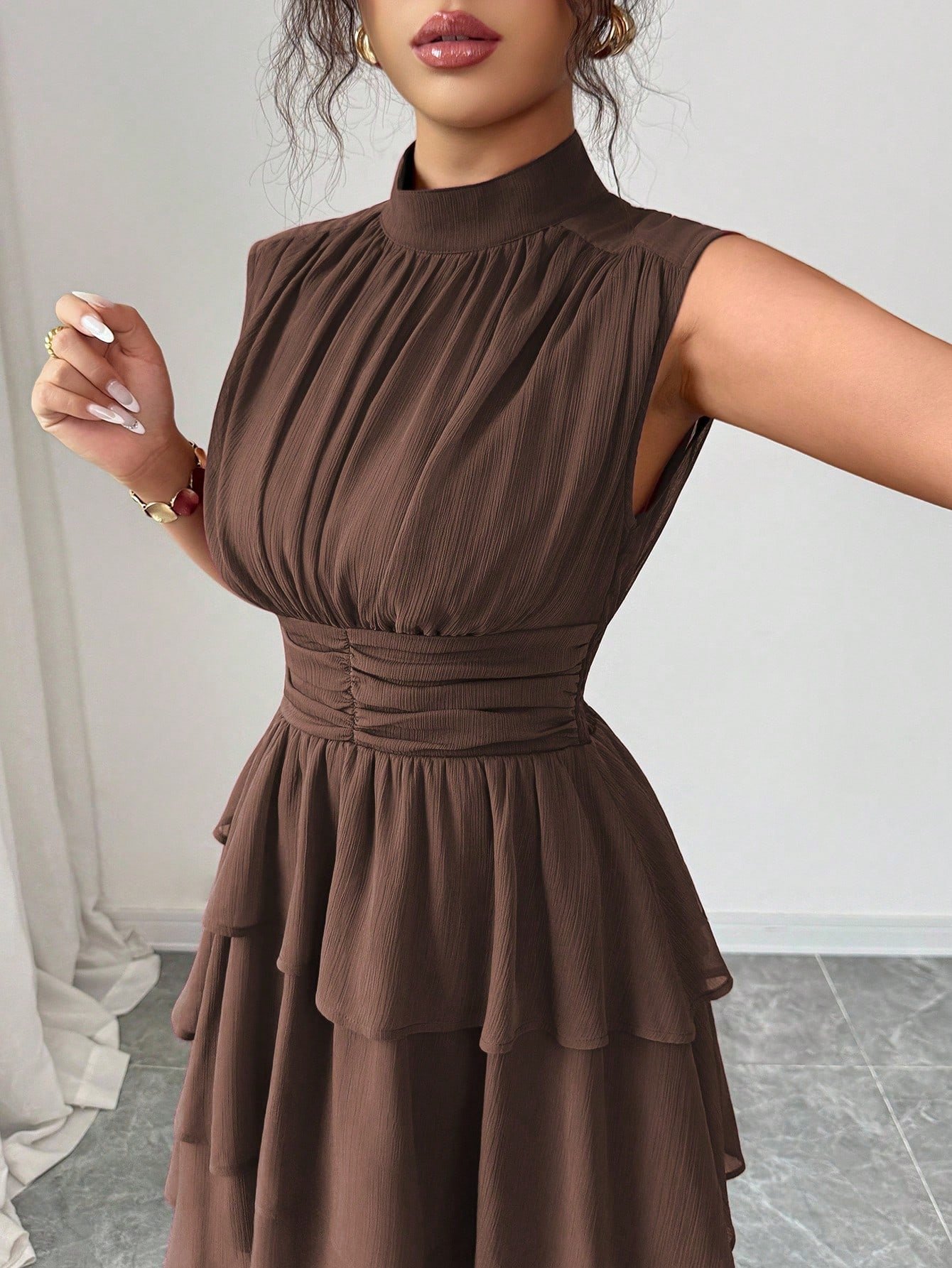 Vestido corto italiano sin mangas de gasa de tela arrugada de unicolor