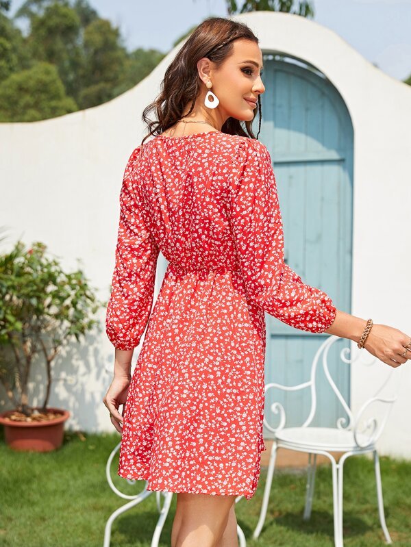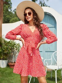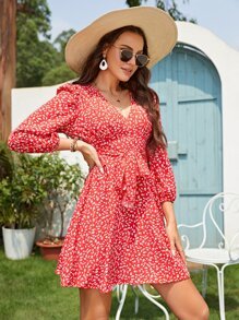 Vestido Corto Para Dama, Vestido Manga Larga, Manga de Farol, Vestido Cuello en V, Estampado Floral, Vestido con Lazo Delantero
