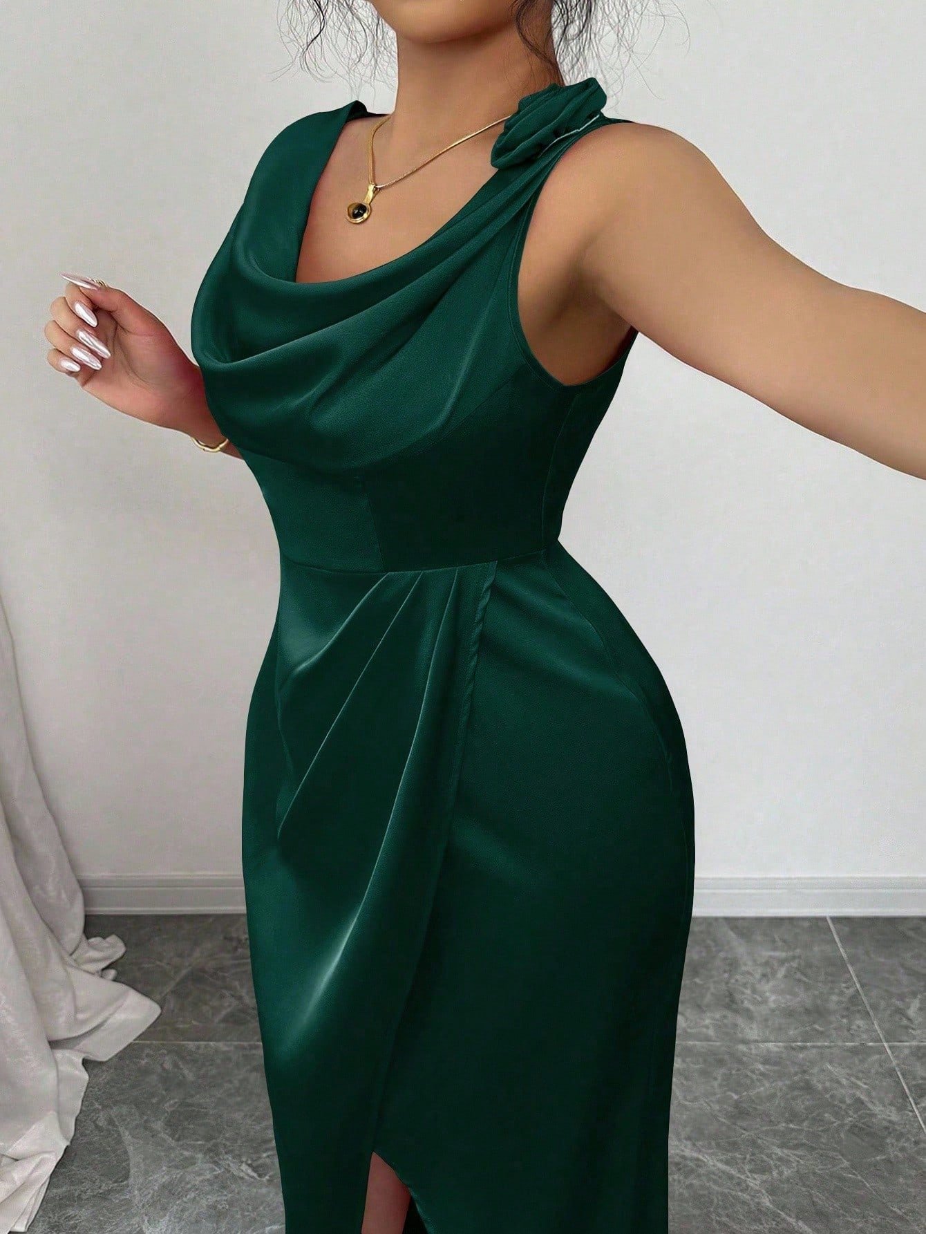 Vestido de tirantes unicolor fruncido de muslo con abertura de saten