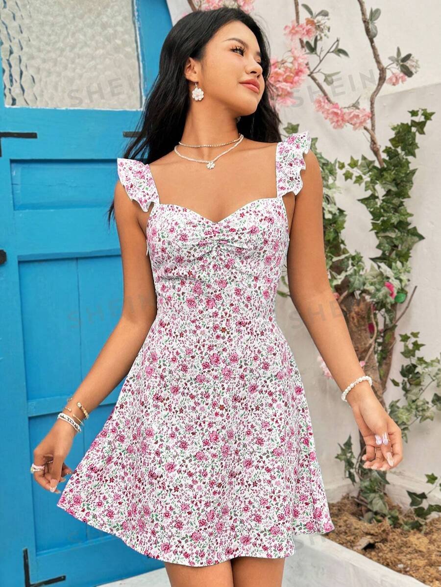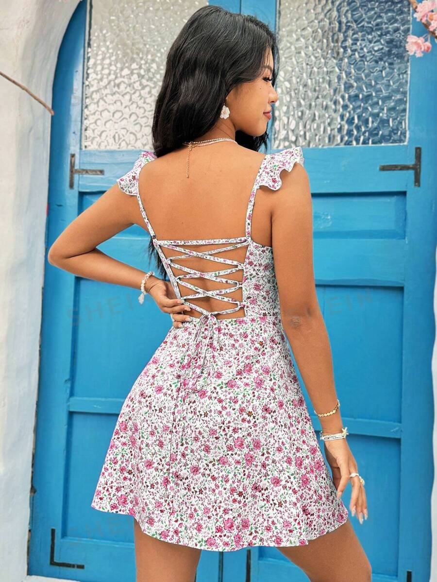 Vestido de flores mini informal con cuello de diamante y espalda abierta
