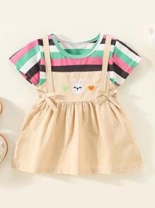 Vestido de manga corta con patr?n de coraz?n y conejo de patchwork a rayas de algod?n puro para ni?a peque?a