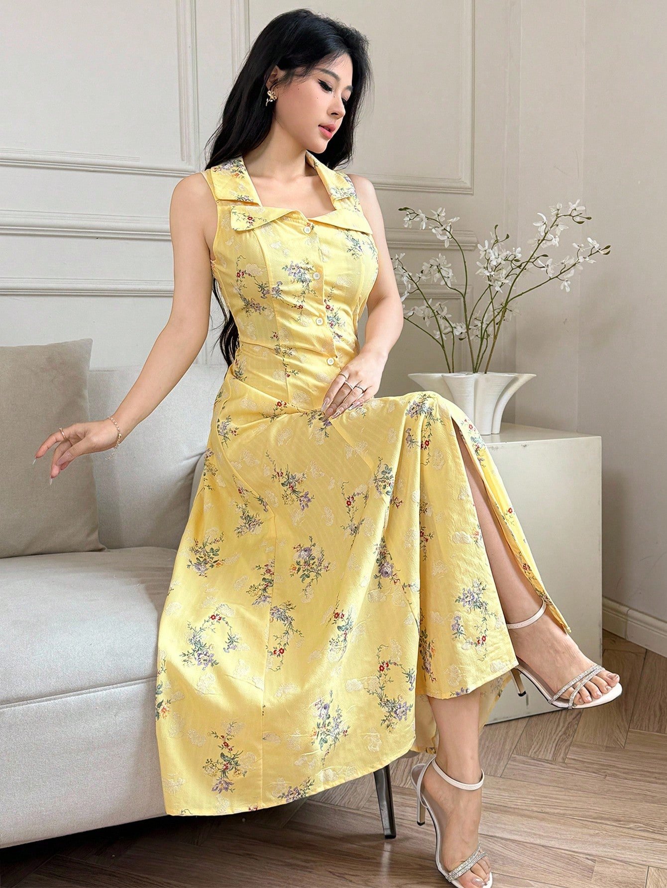 Vestido unicolor de cuello alzado con liga