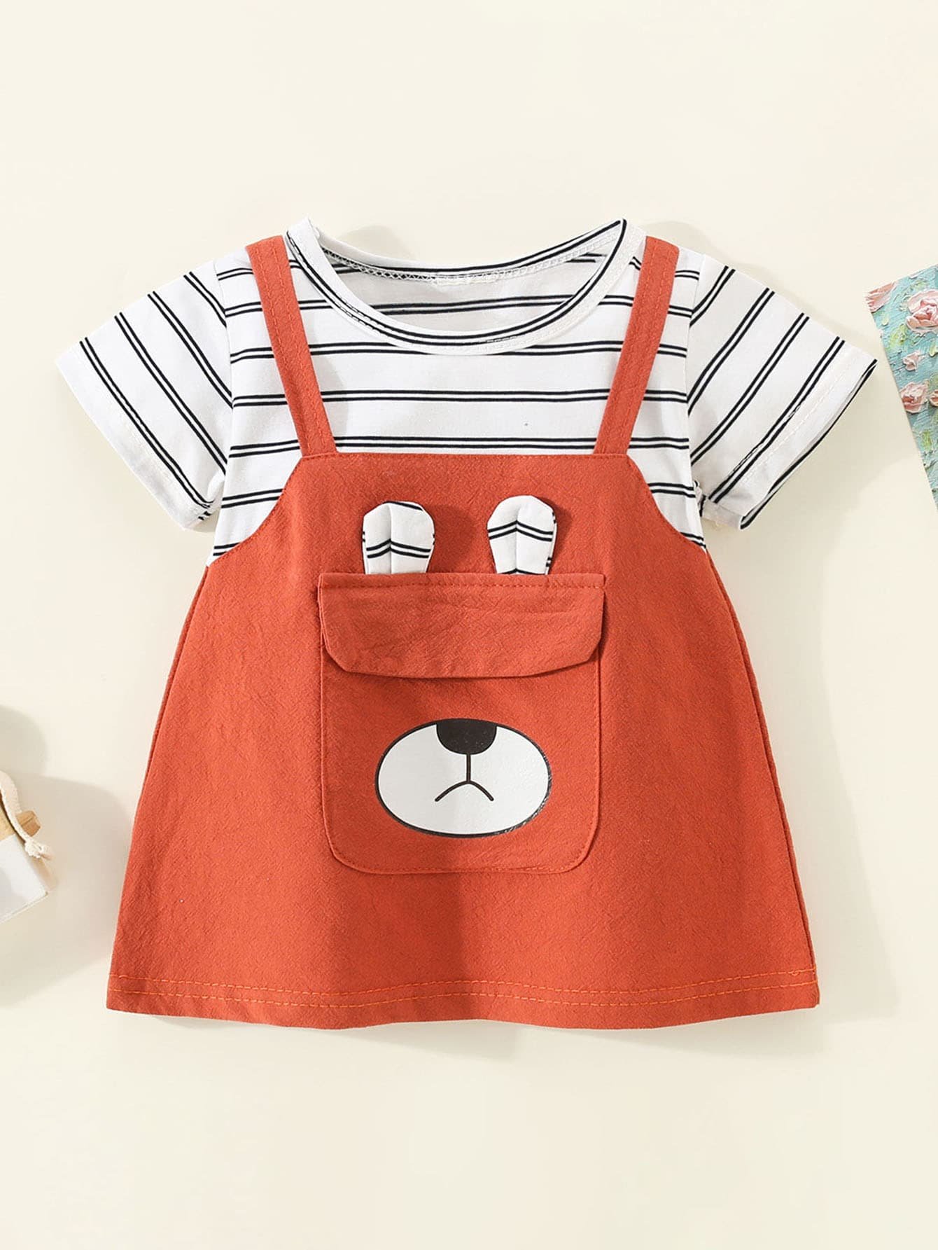 Vestido de manga corta estilo gato de patchwork a rayas de algod?n puro para ni?a peque?a