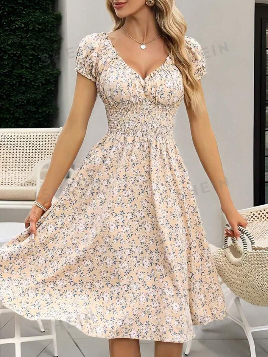 Vestido de mujer con estampado floral discreto, cuello en V y cintura ajustable