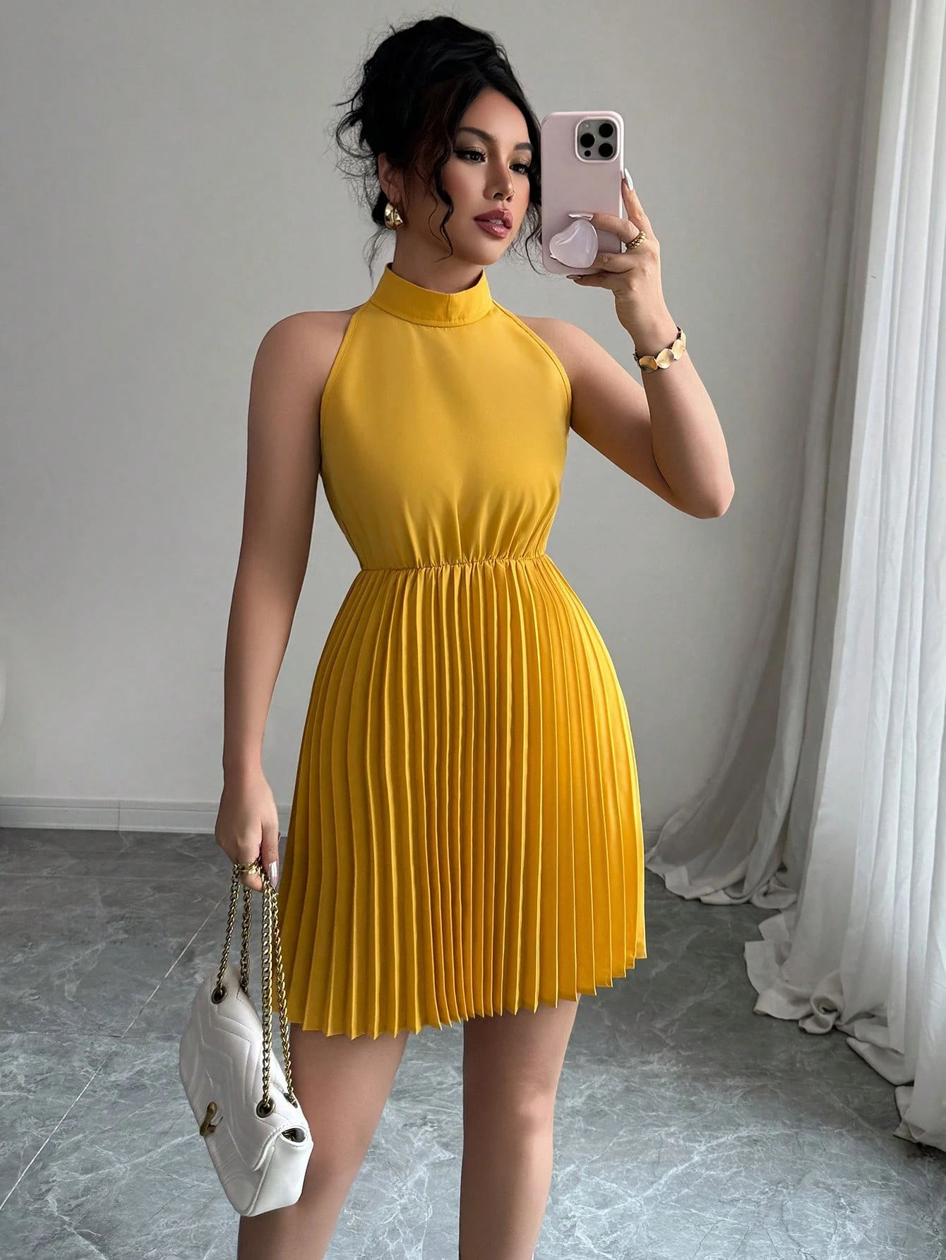 Vestido de mujer de un solo color con decoración de perlas falsas