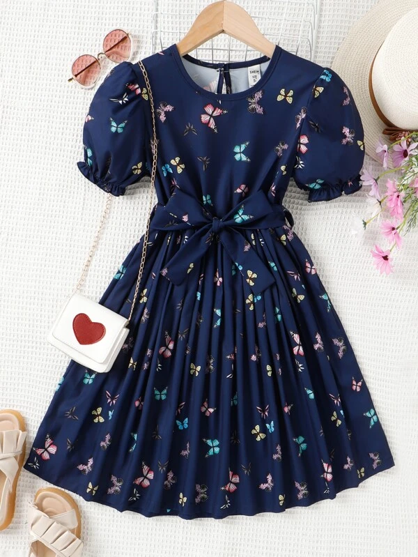 Vestido De Ni?a Preadolescente Con Estampado Floral, Con Mangas De Ala De Mariposa Y Cintur?n