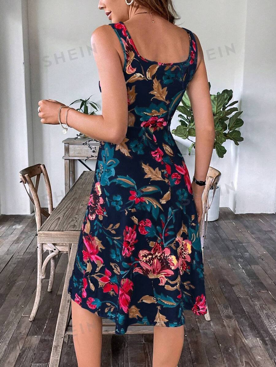 Vestido de primavera para mujer con cuello cuadrado y corte en A con estampado floral