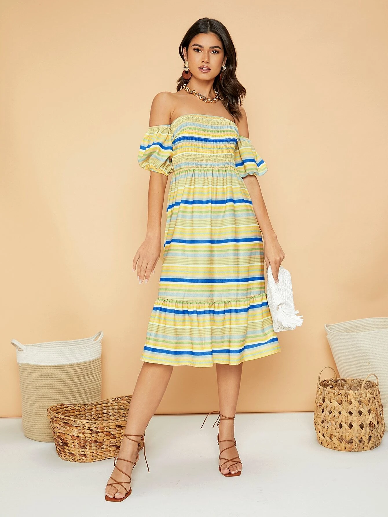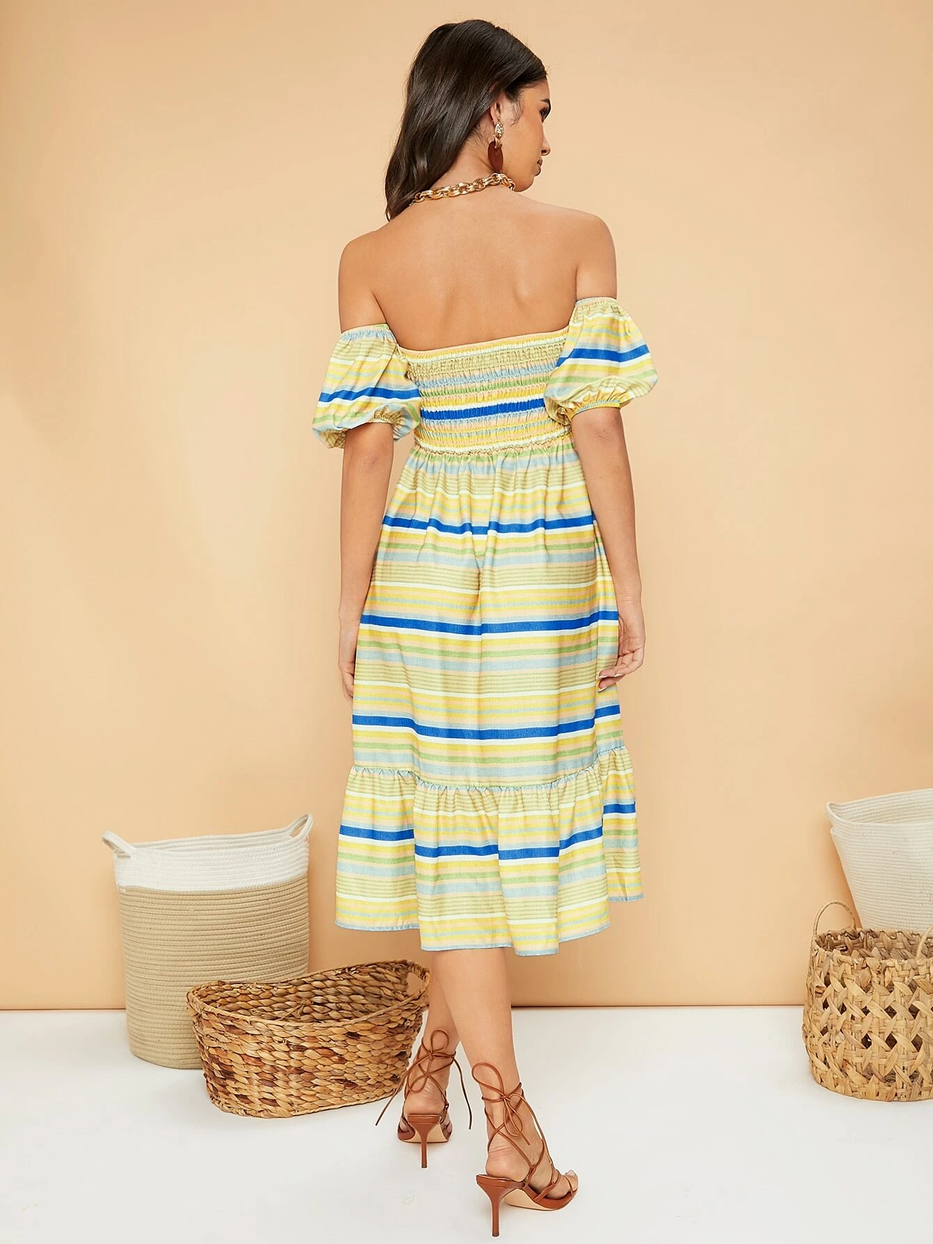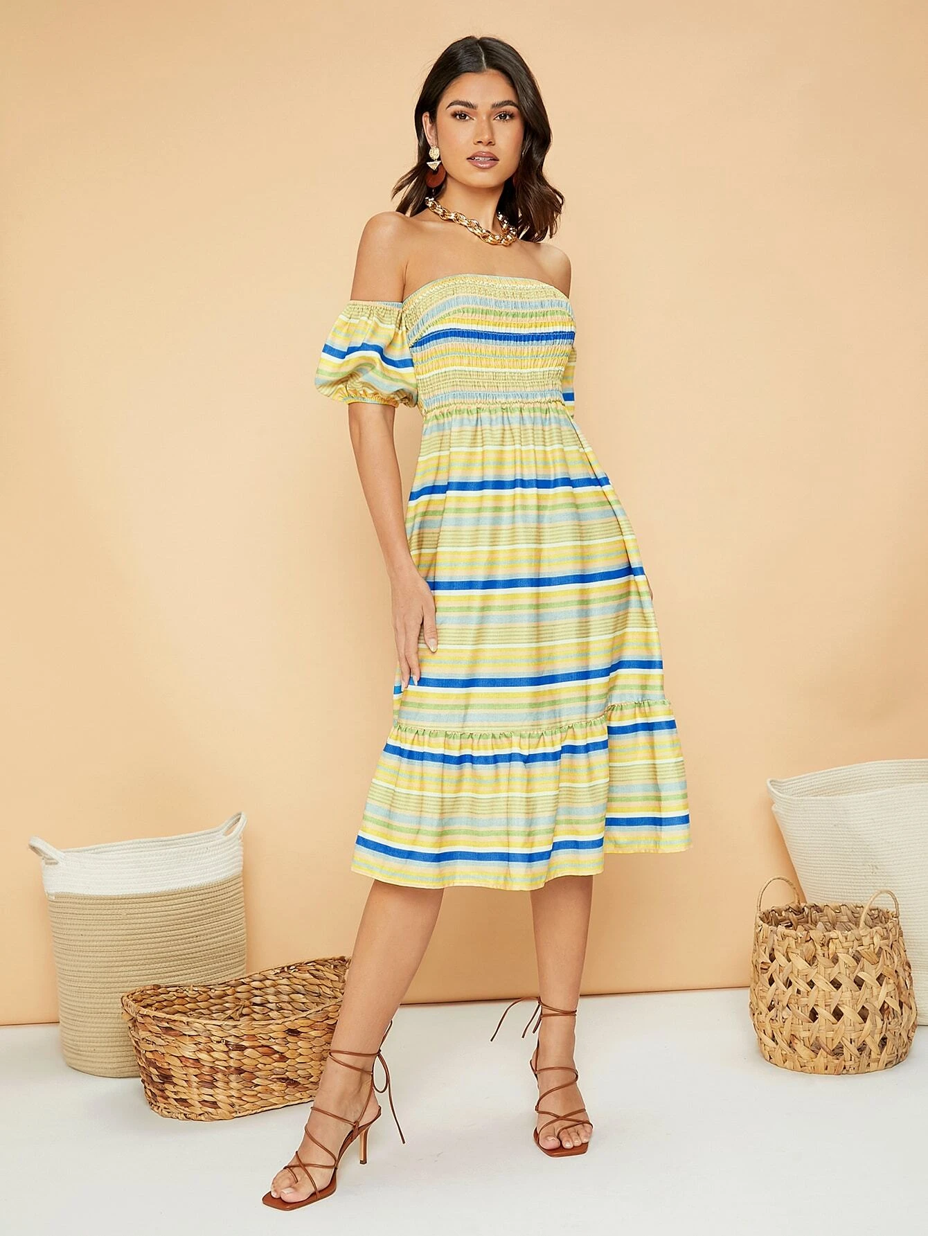 Vestido de rayas de colores de hombros descubiertos con fruncido bajo con fruncido