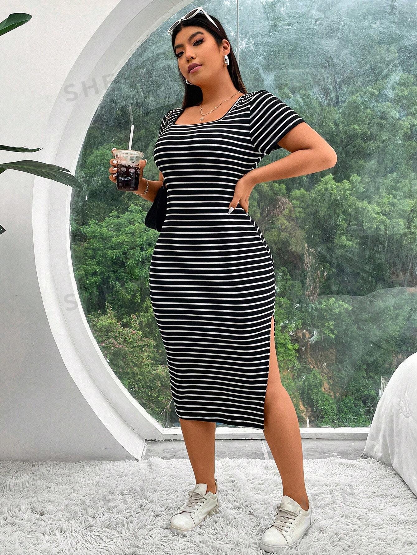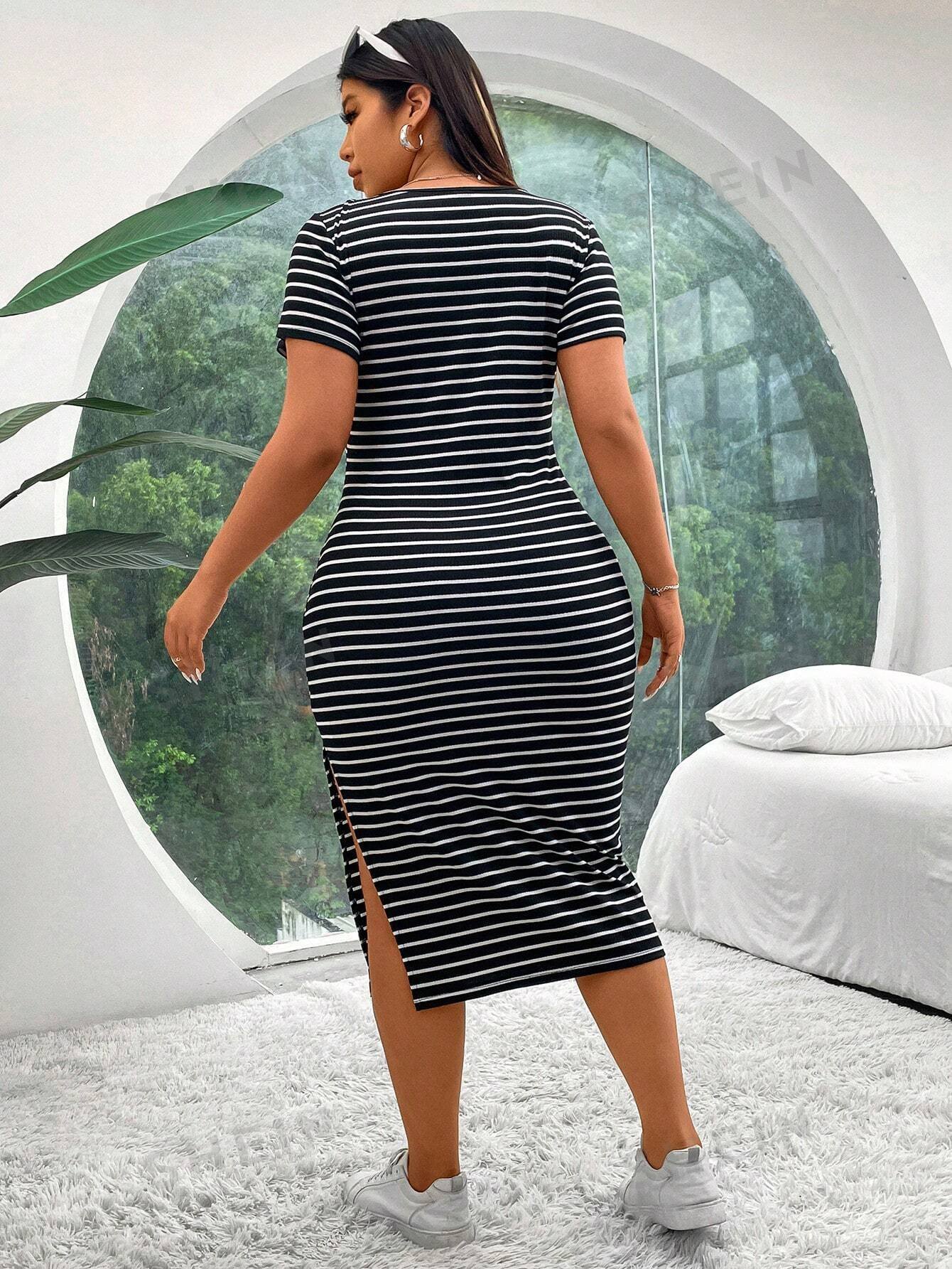 Vestido de talla grande con rayas y estampado casual y dobladillo dividido