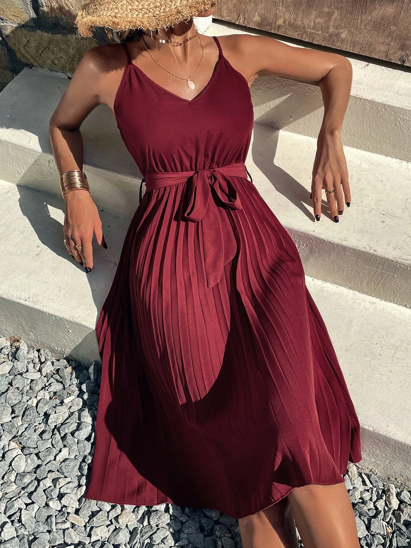 Vestido de tirantes bajo fruncido con cintur?n