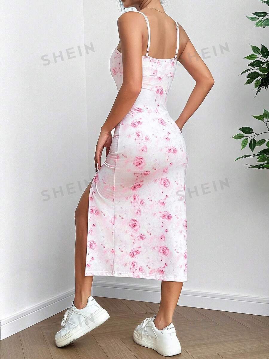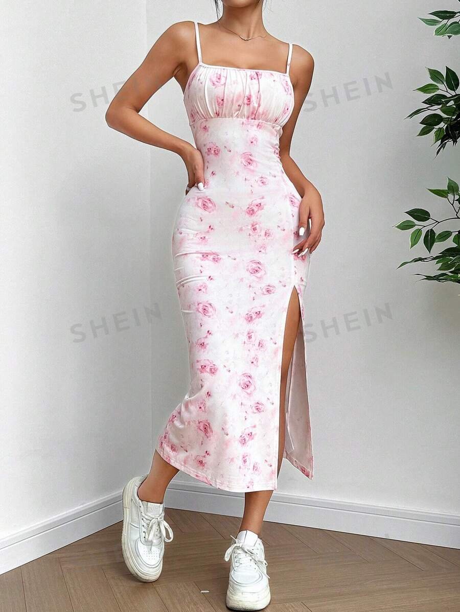 Vestido de tirantes con estampado de flores y abertura en la falda para mujer