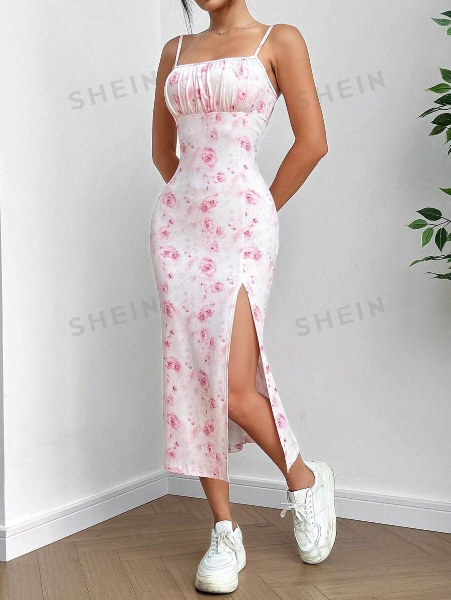 Vestido de tirantes con estampado floral pecho con fruncido