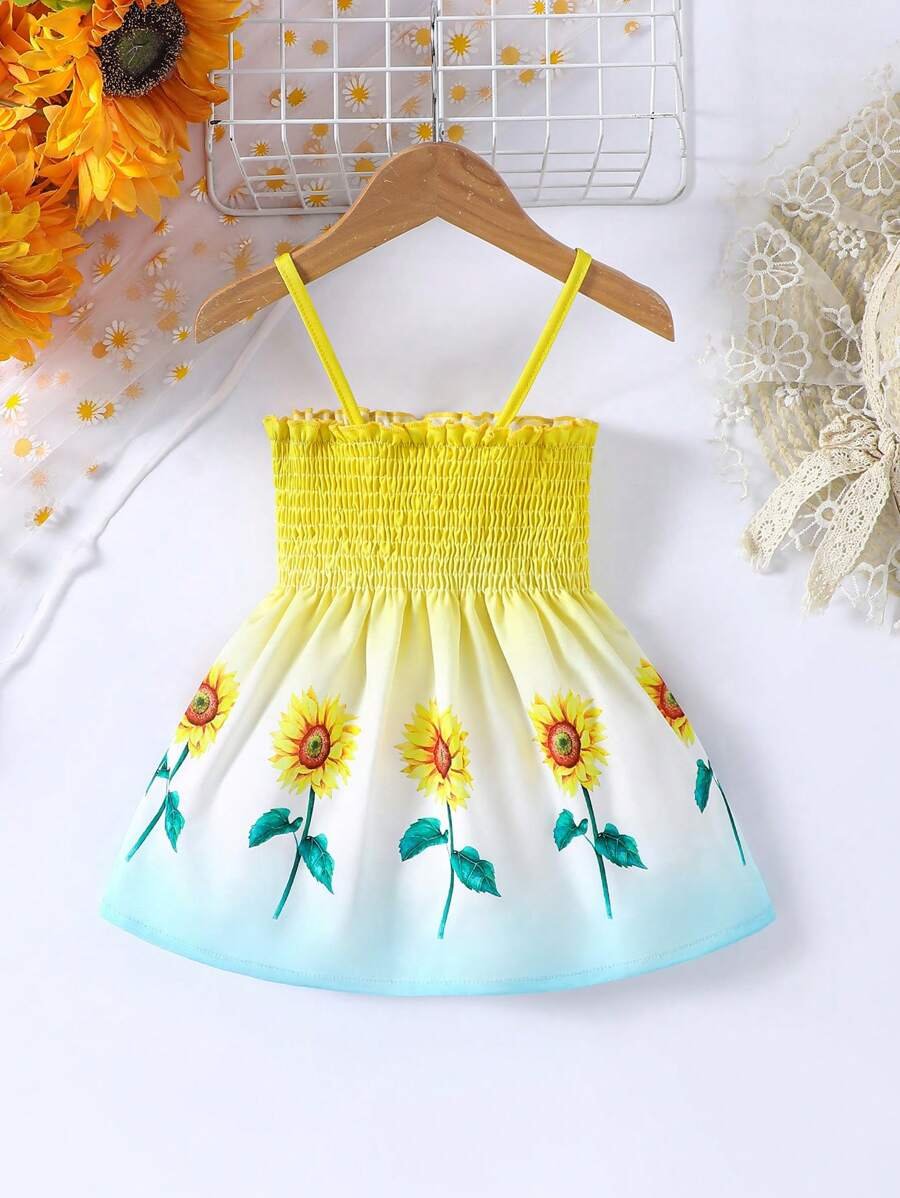 Vestido de tirantes con ribete de volantes y estampado de girasoles para ni?as beb?s para el verano
