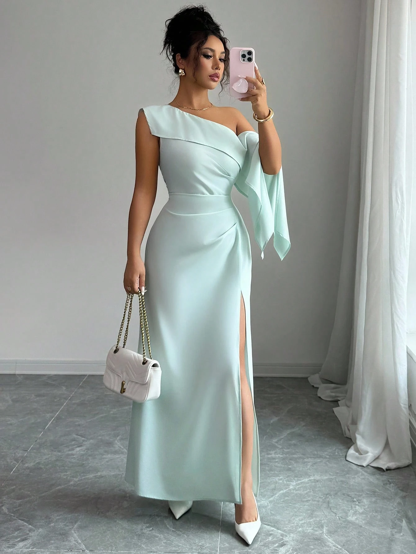 Vestido de tirantes unicolor fruncido de muslo con abertura de saten