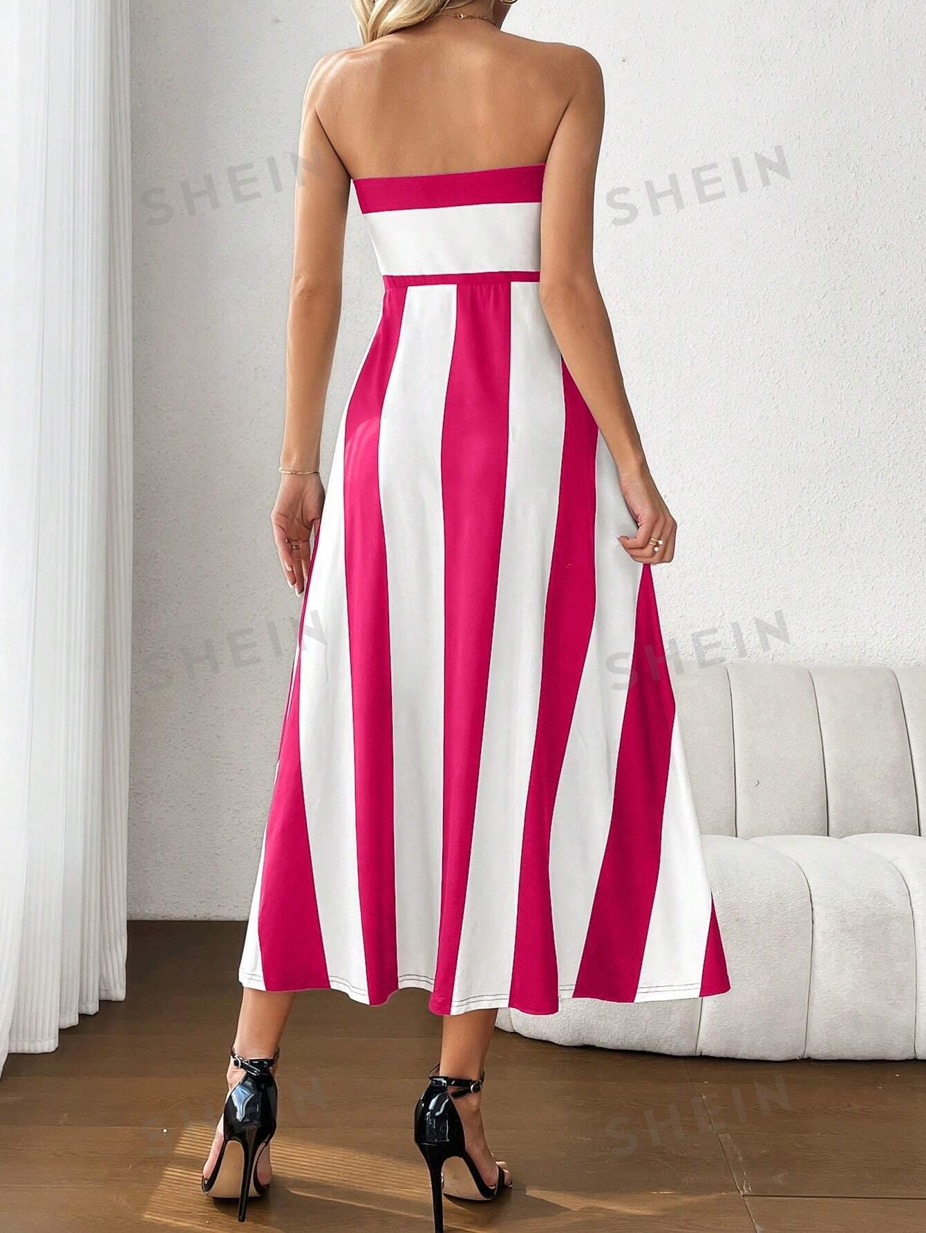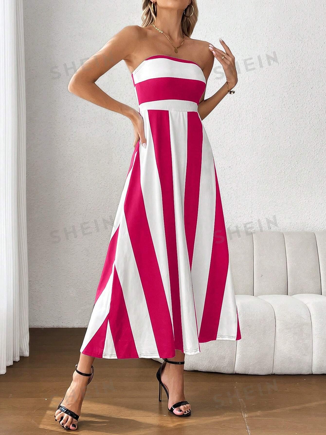 Vestido de verano para mujer sin tirantes con bloques de color a rayas