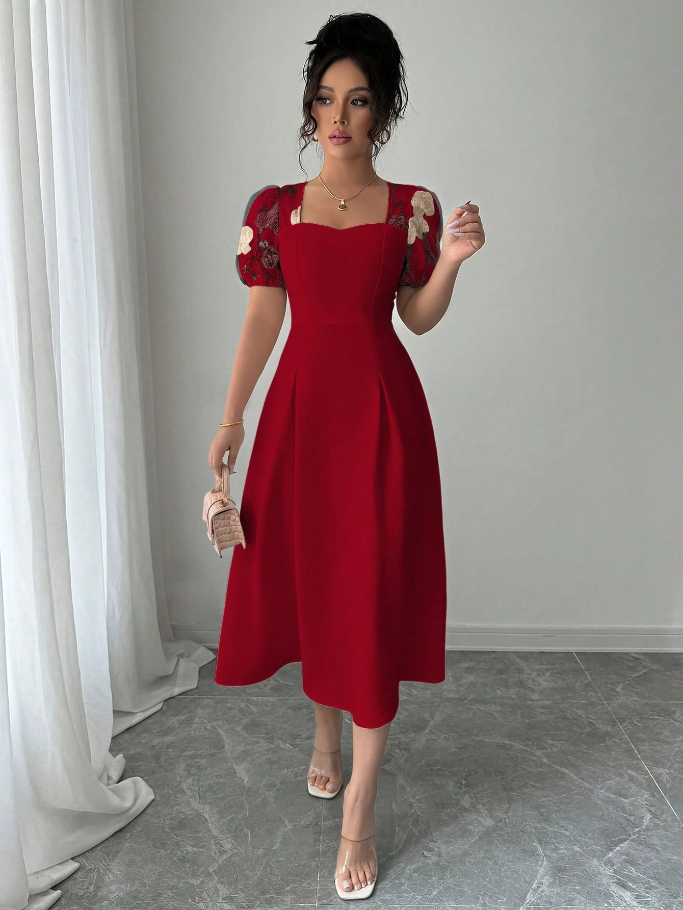 Vestido de punto unicolor de manga farol sin cintur?n