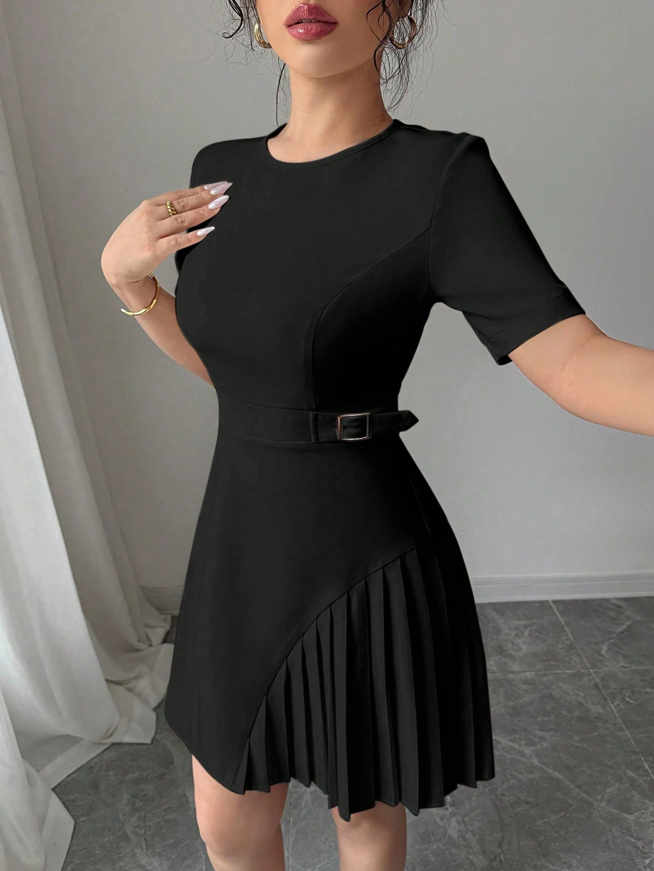 Vestido elegante con cuello redondo, manga corta y dobladillo plisado