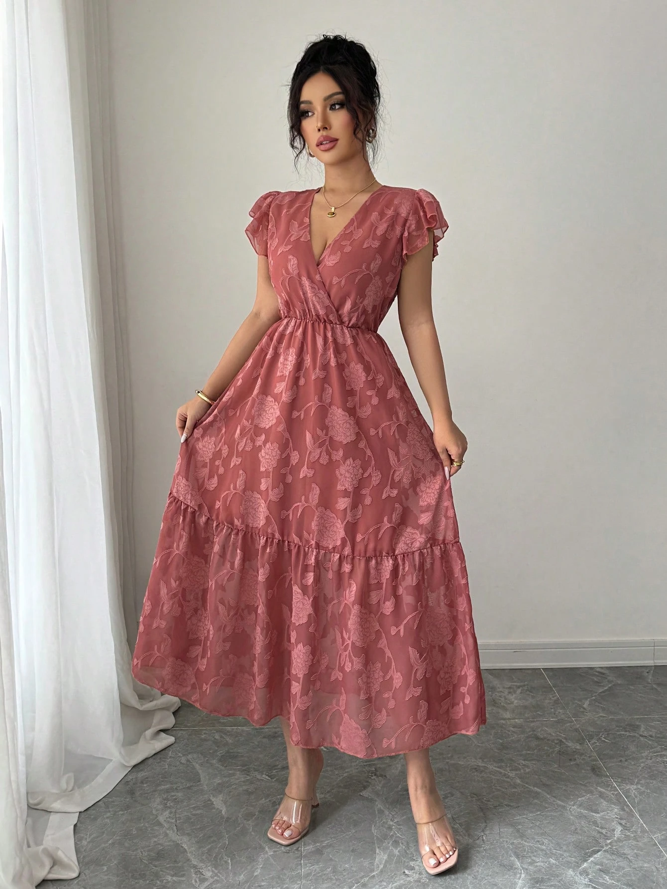 Vestido elegante de manga corta con cuello en V y longitud hasta la rodilla
