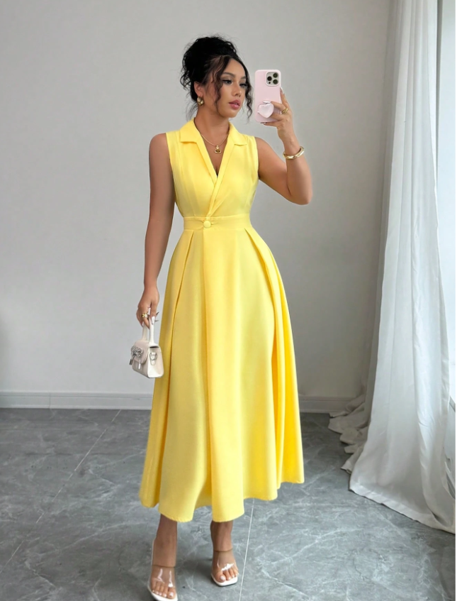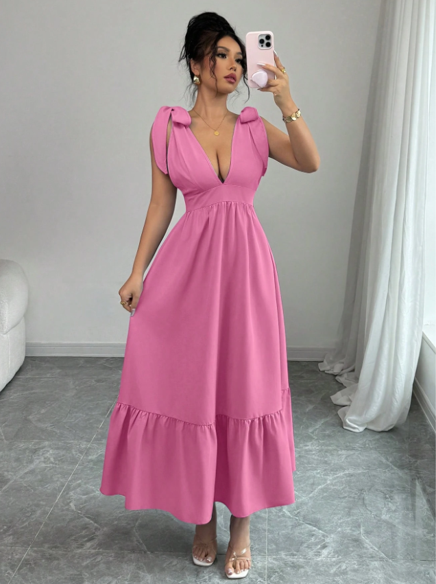 Vestido elegante sin mangas con escote en V y cintura anudada con lazo