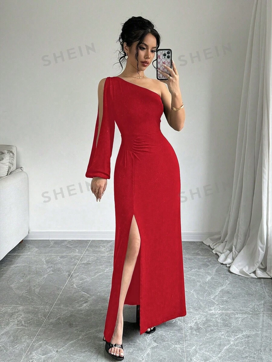 Vestido largo de manga larga con cuello asimétrico