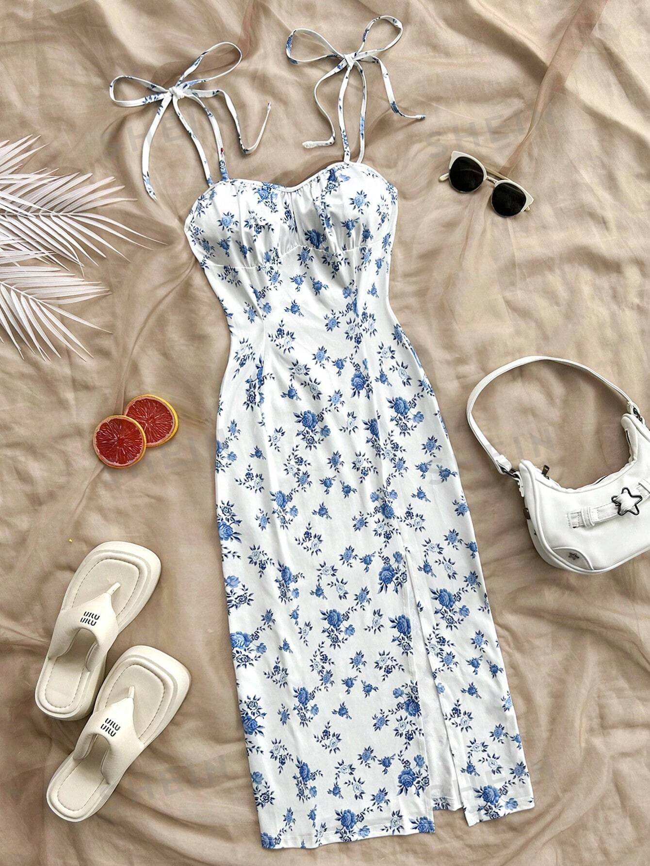 Vestido largo, elegante, con mangas abullonadas con diseño floral