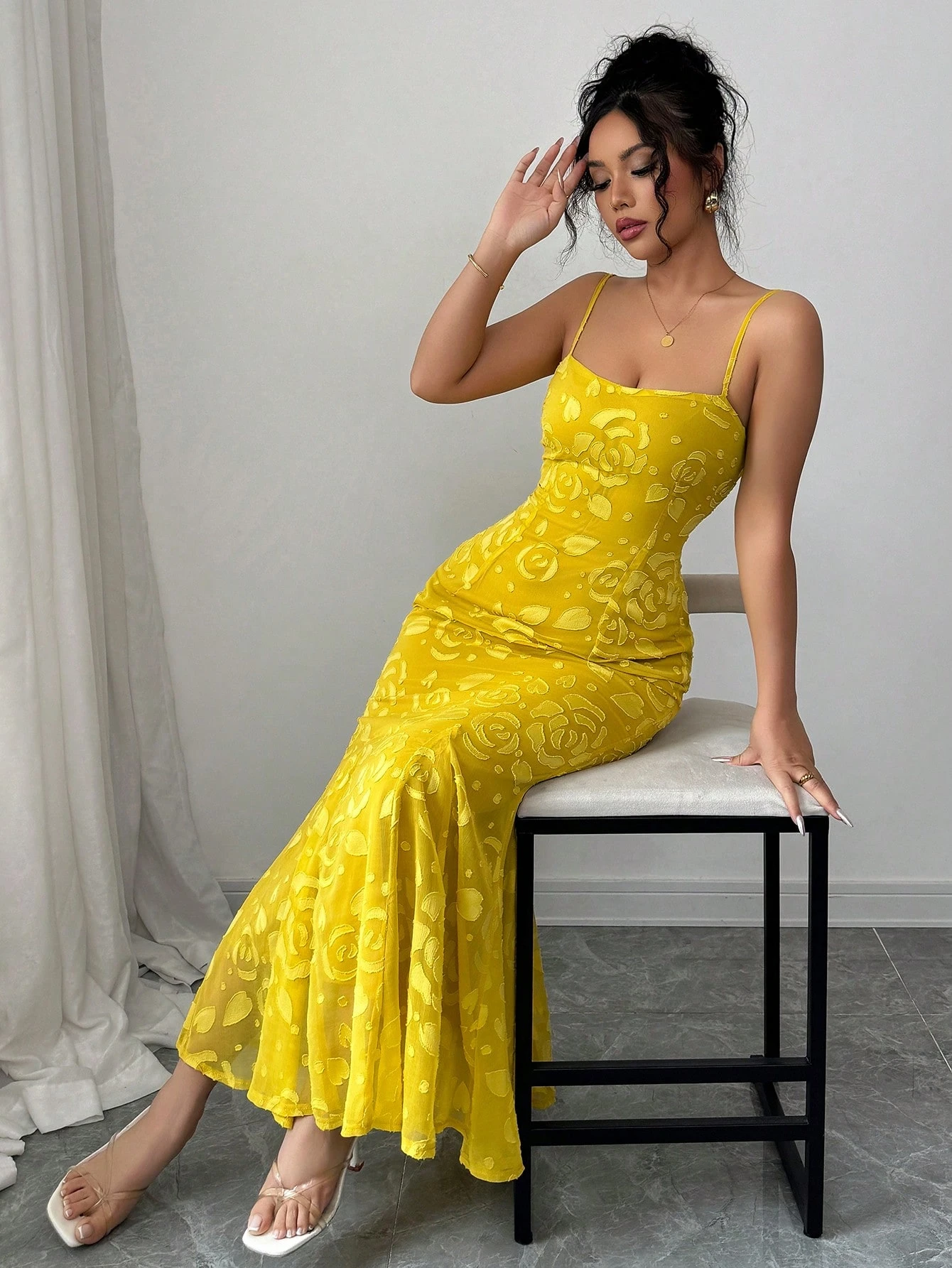 Vestido largo sexy y elegante de encaje jacquard y ajuste de cintura