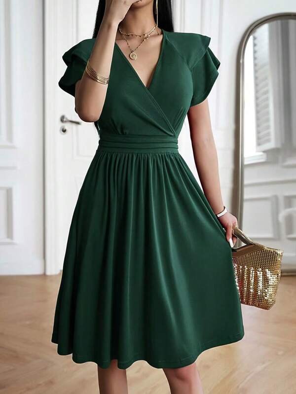 Vestido linea A unicolor de cuello cruzado de manga mariposa