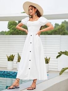 Vestido Liso, Largo Para Dama, Vestido con Dise?o Fruncido, Vestiso Con Botones, Vestido Mangas de Farol, Cuello Cuadrado