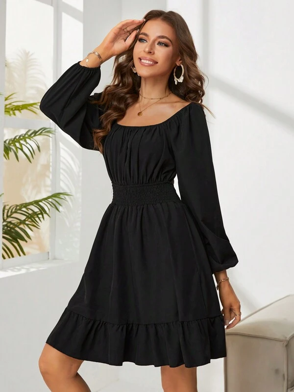 Vestido Liso Para Dama, Vestido Con Volante, Fruncido, Vestido Manga Larga, Vestido Manga de Farol, Vestido Cintura Fruncida, Vestido Con Mo?o Trasero, Vestido Escote Cuadrado