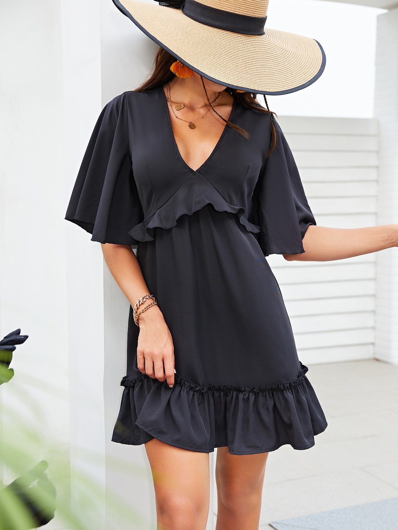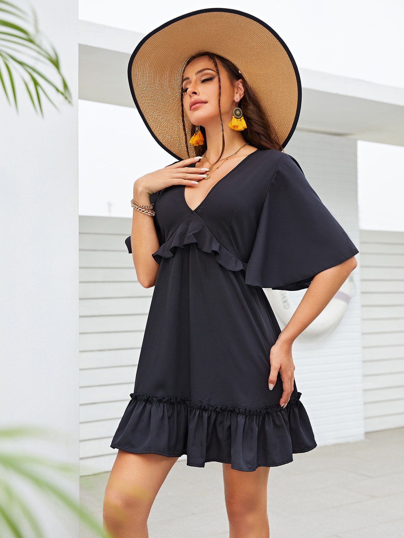 Vestido Liso Para Mujer, Vestido con Cuello en V, Vestido Manga de Campana, Vestido con Ribete Fruncido