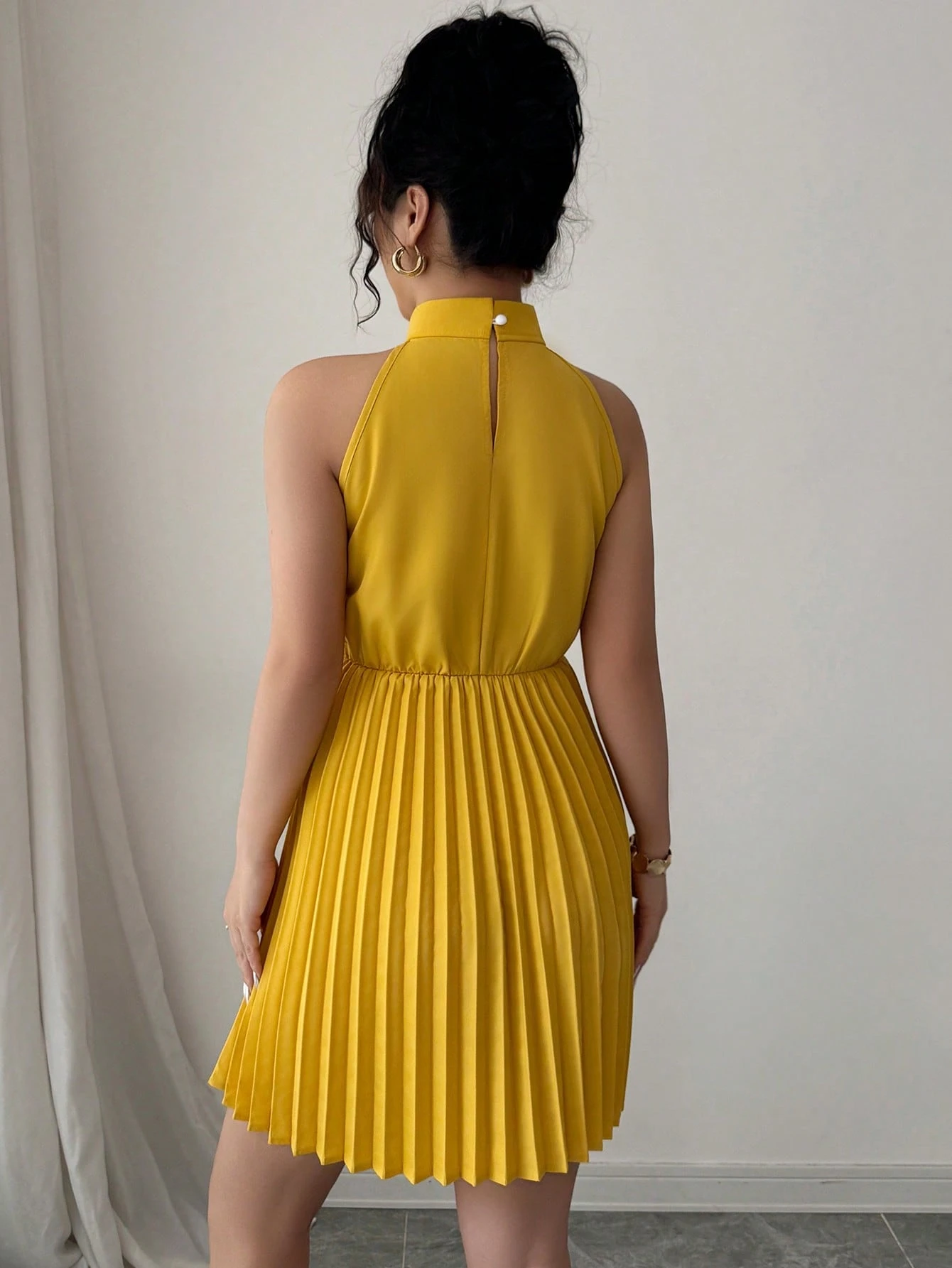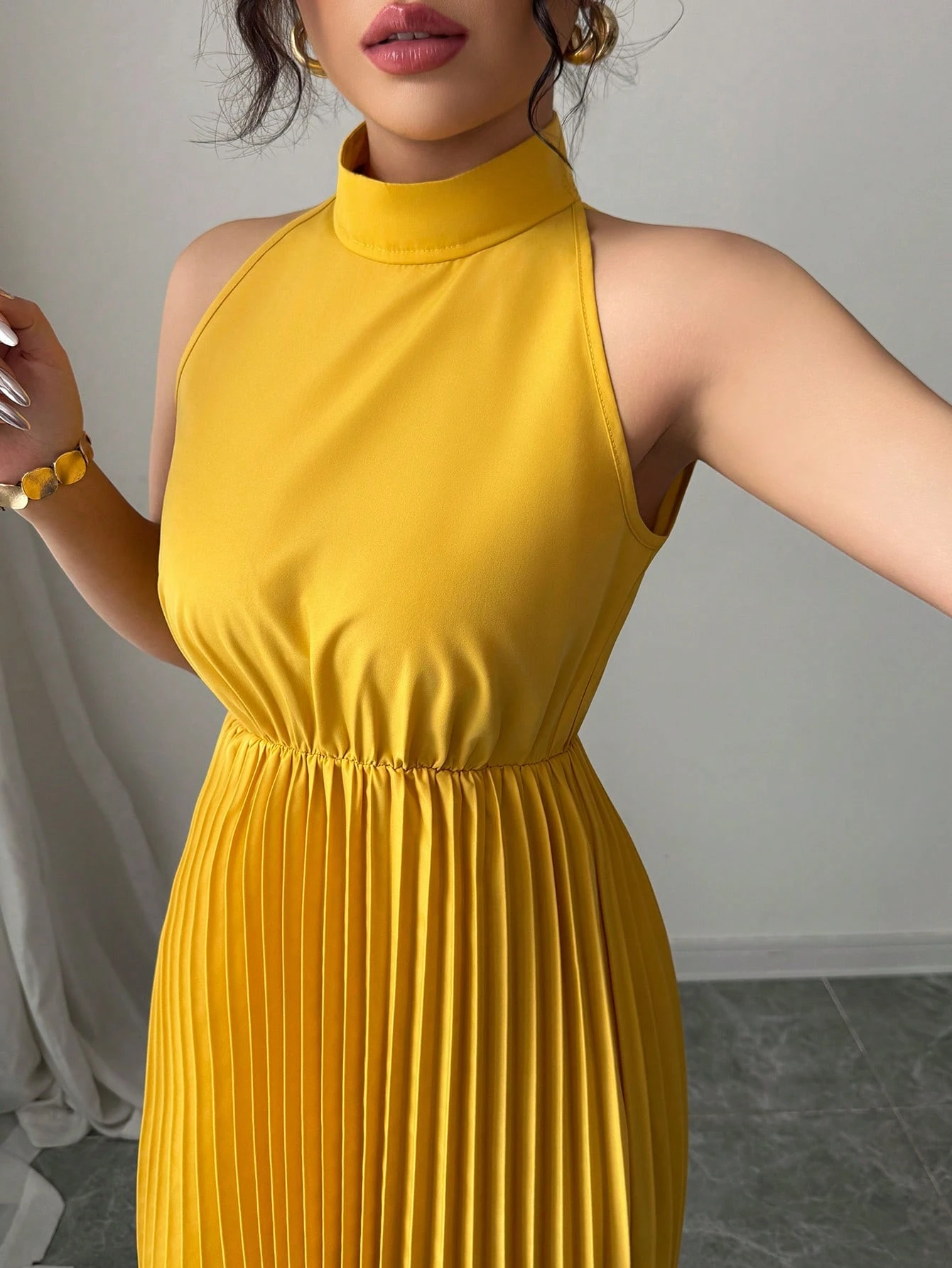 Vestido midi ajustado con pliegues acordeón, sin mangas y cuello alto
