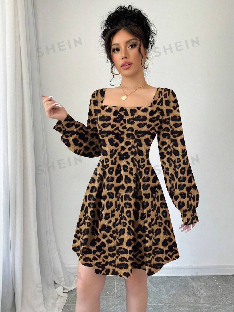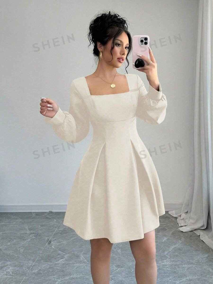 Vestido midi de mujer elegante de unicolor con cuello cuadrado