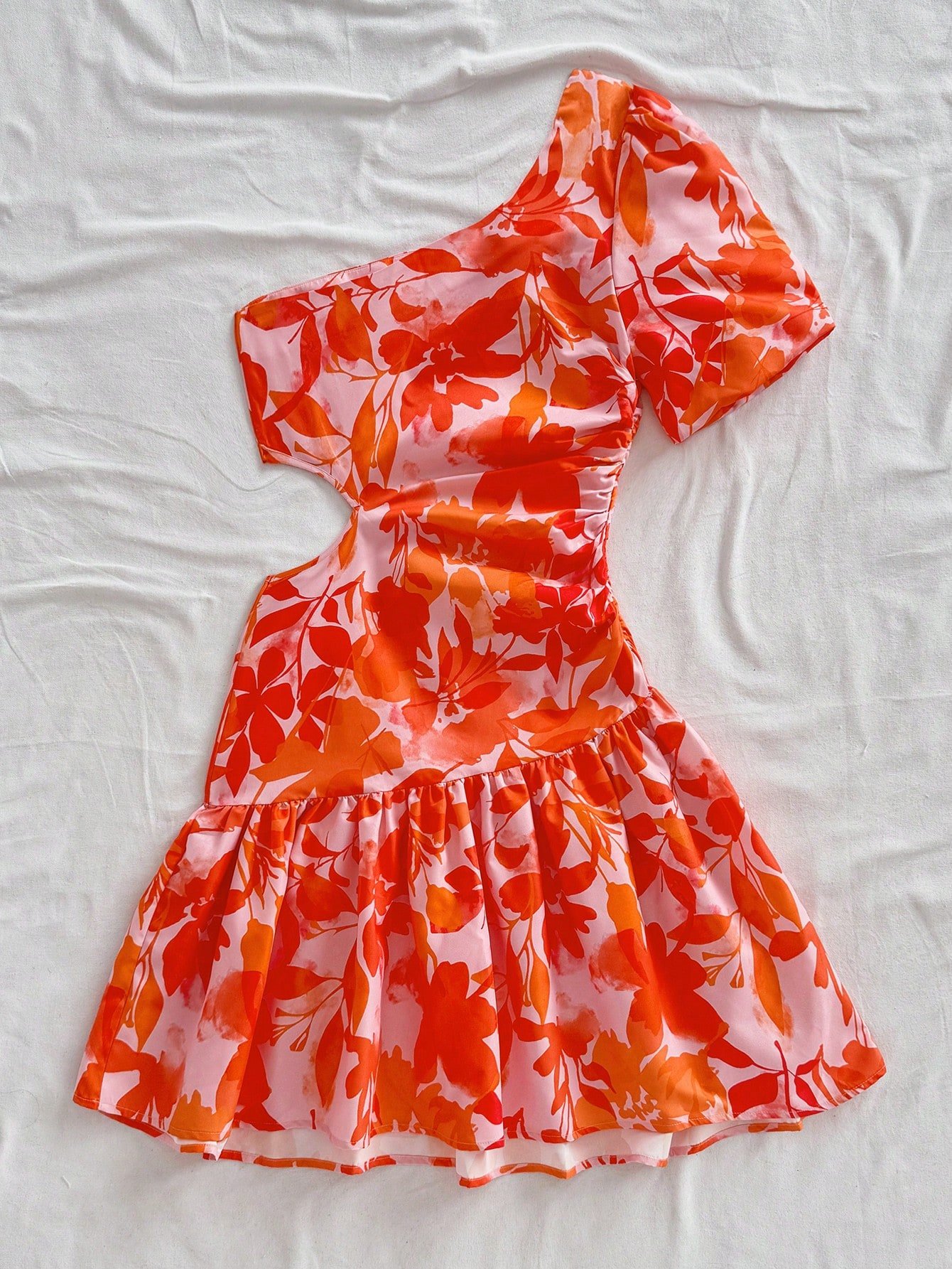 Vestido mini ajustado con un hombro, manga abullonada, bajo asimétrico