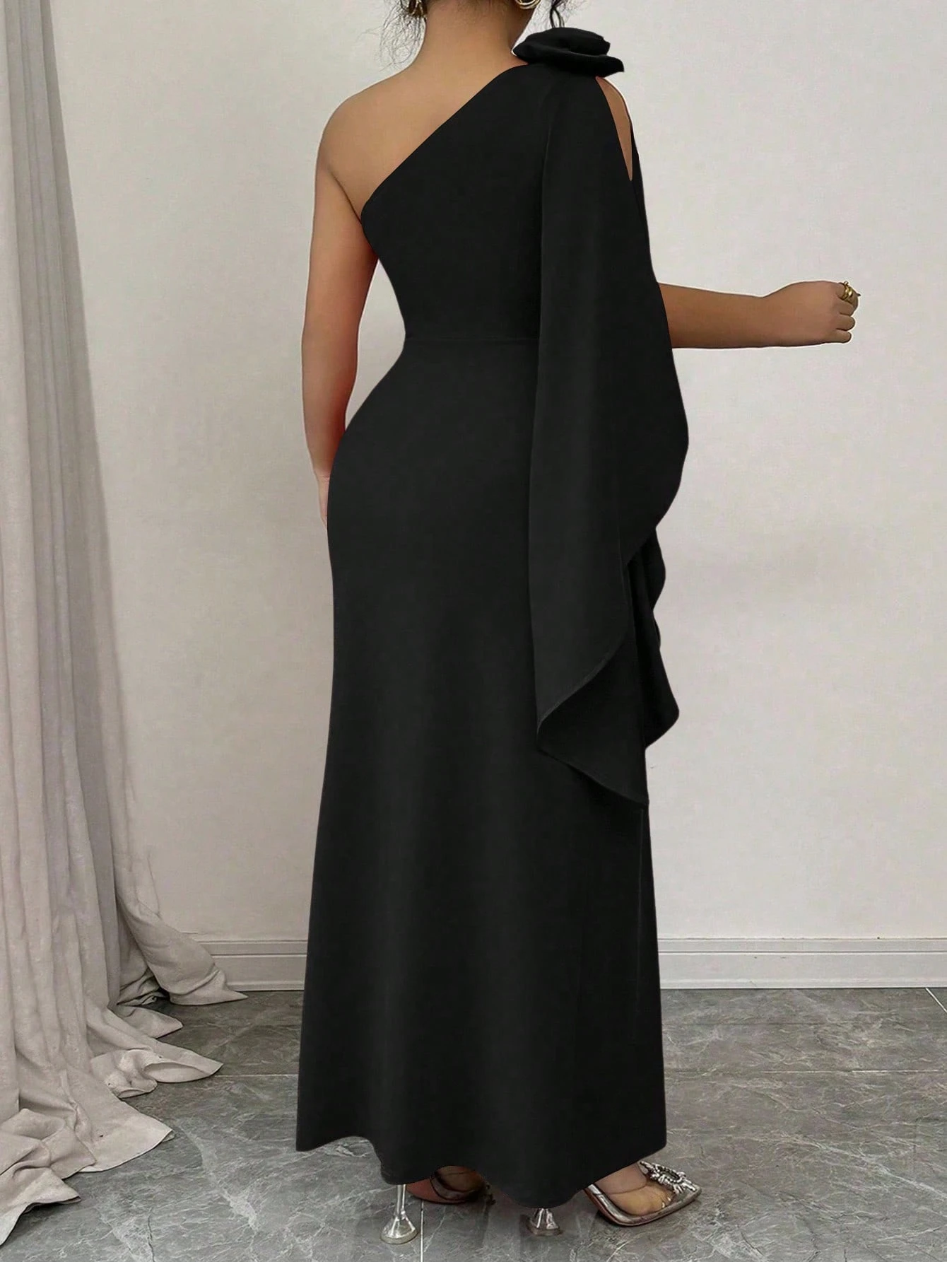 Vestido negro con pliegues en el frente de un solo hombro elegante y encantador