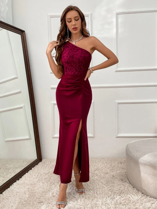 Vestido panel con encaje floral de un hombro de muslo con abertura