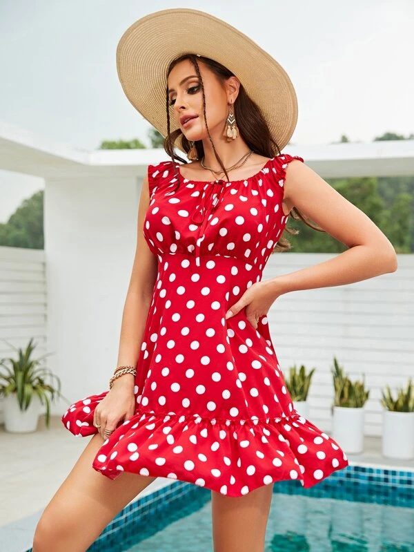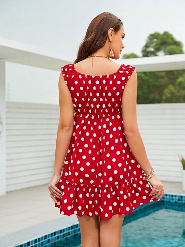 Vestido Para Dama, Vestido Vintage, Vestido Sin Manga, Vestido Estampado a Lunares, Vestido con Ribete Fruncido