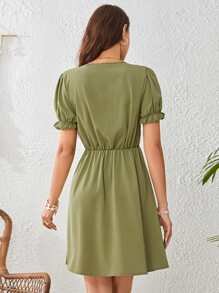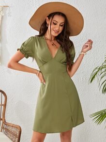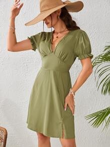 Vestido Para Mujer, Vestido Liso, Vestido Manga de Farol, Vestido Con Escote en V Profundo, Vestido con Peque?a Abertura Lateral Inferior