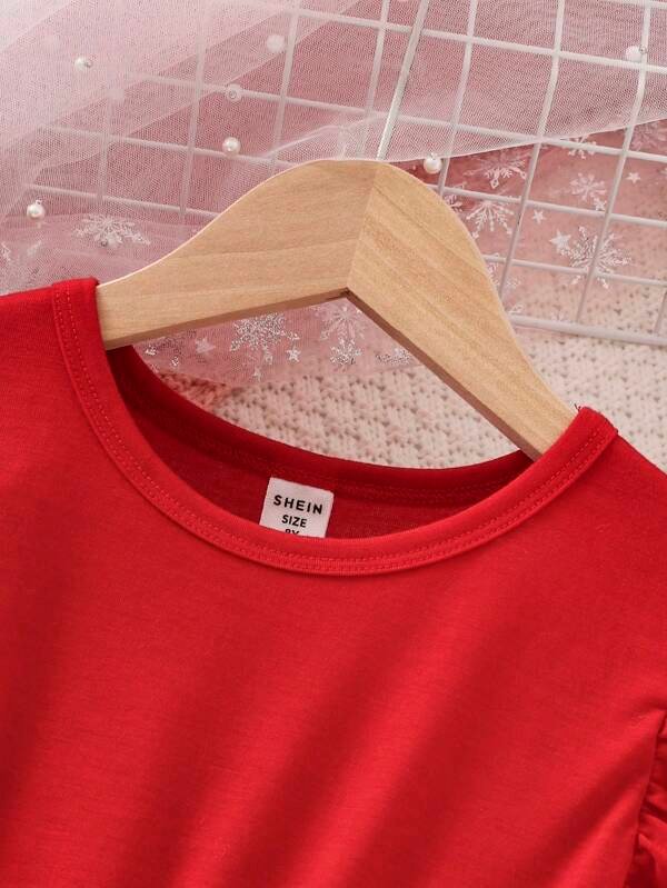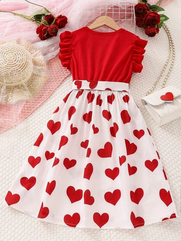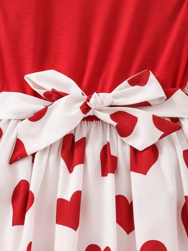 Vestido Rojo Con Cintur?n Y Estampado De Corazones Para Ni?as Preadolescentes