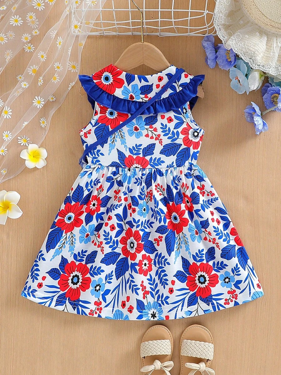 Vestido sin mangas lindo con estampado floral para bebé niña con cuello de volantes y bolso