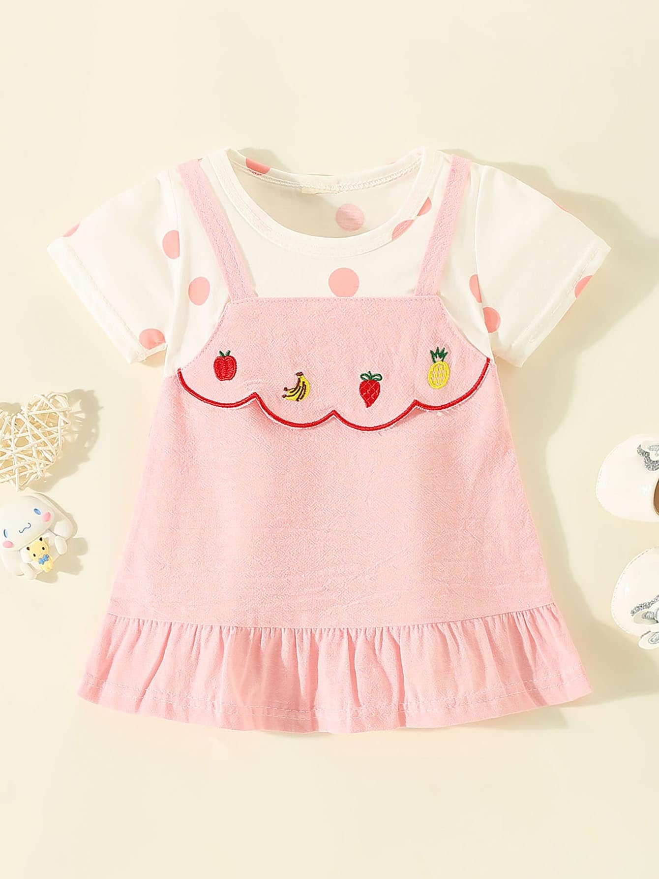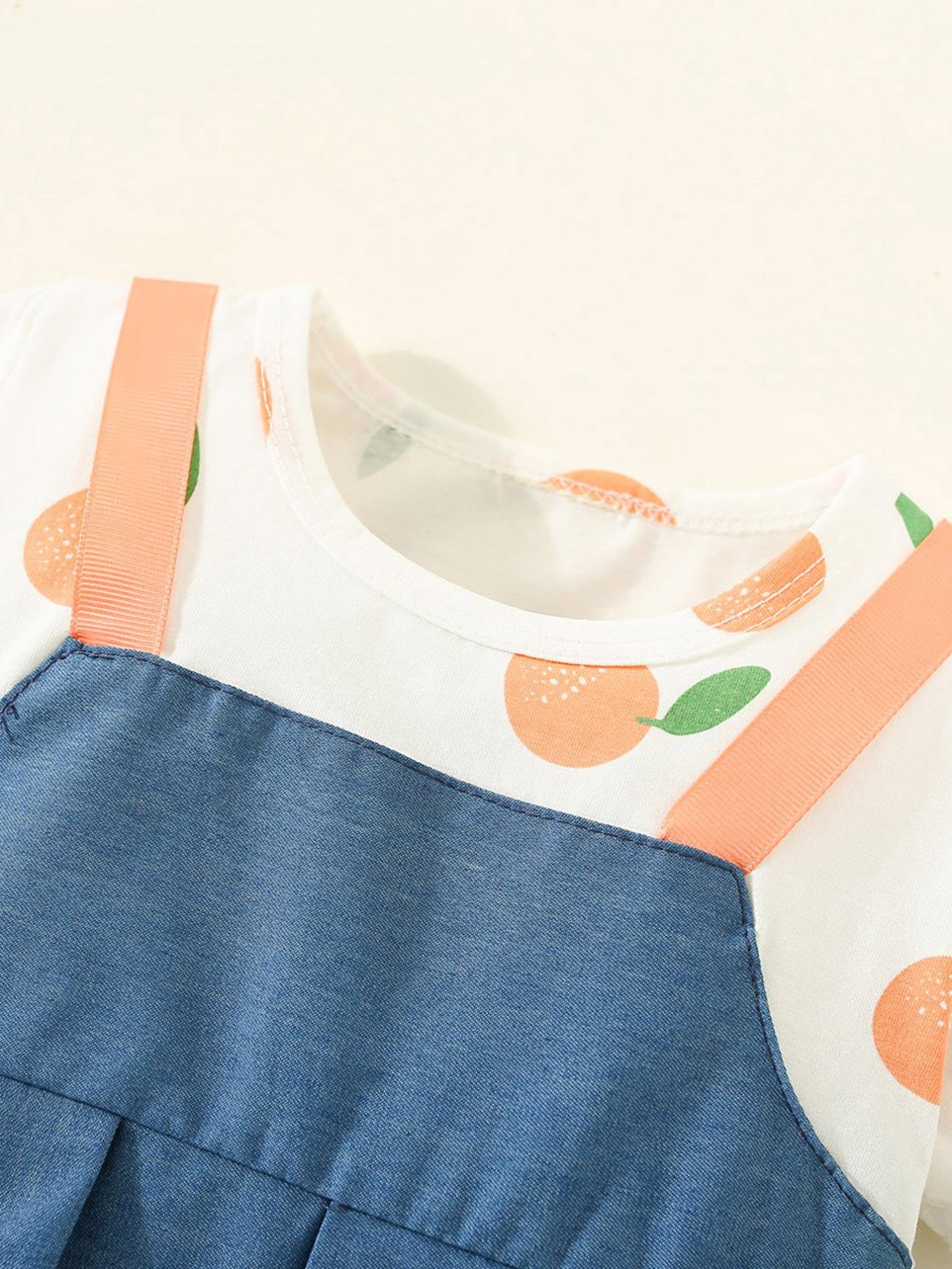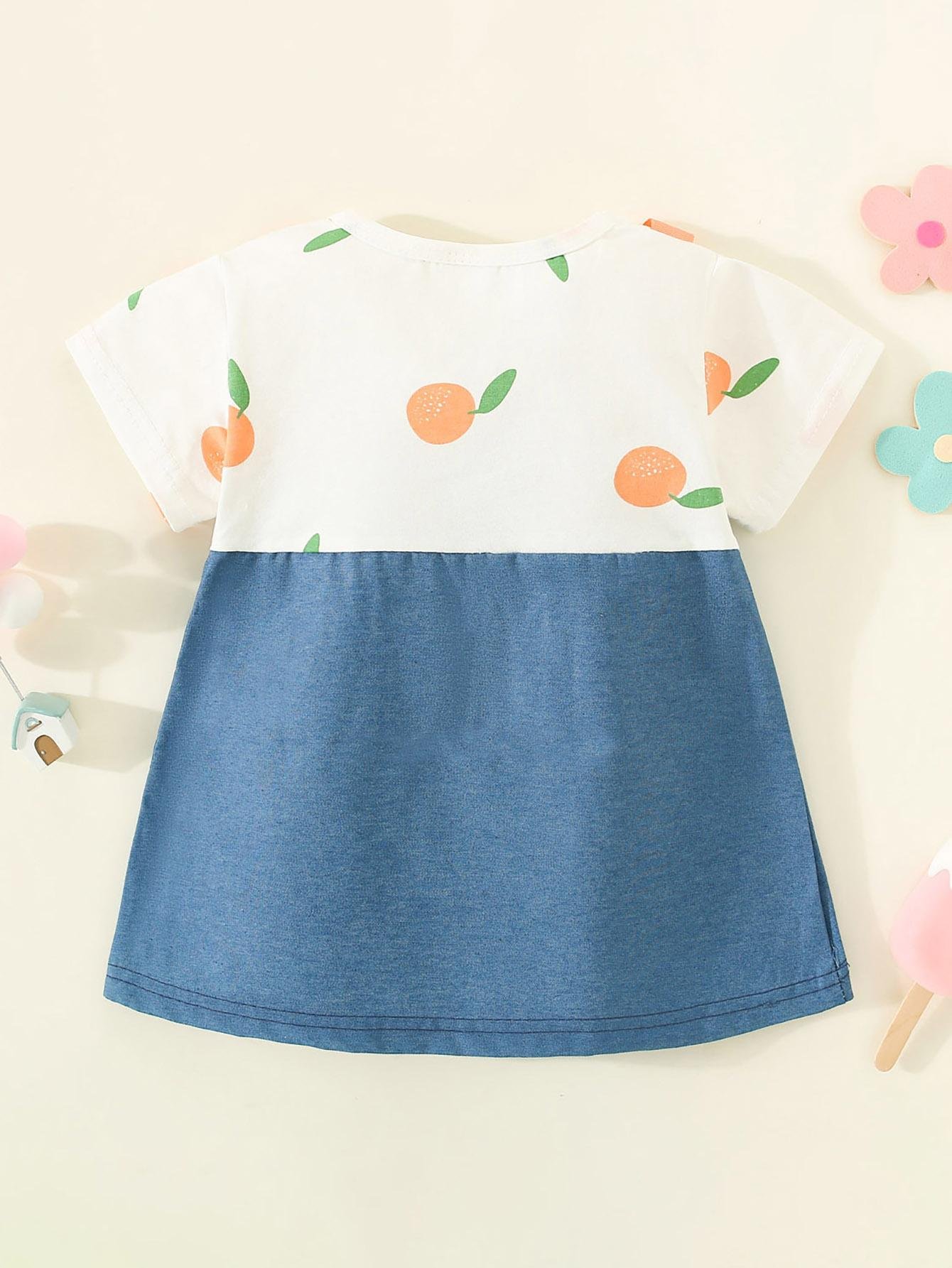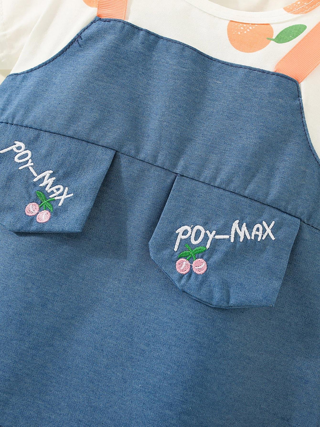 Vestido vaquero de manga corta con estampado de letras y cerezas de algod?n puro para ni?a peque?a